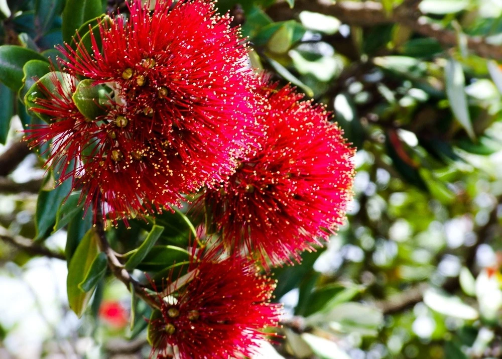 l’arbre de noël de nouvelle-zélande sempervirent fleurit lors du passage à la nouvelle année. Il est donc considéré comme arbre de noël. Les arbres dans l’hémisphère nord montre ses touffes denses de fleurs en forme de pinceau plutôt entre mai et août. Les fleurs constratent vivement avec les feuilles douces et gris argenté. L’arbre aussi nommé pohutukawa = bois de fer par les maoris peut être cultivé dans un bac et est très tolérant à la coupe.