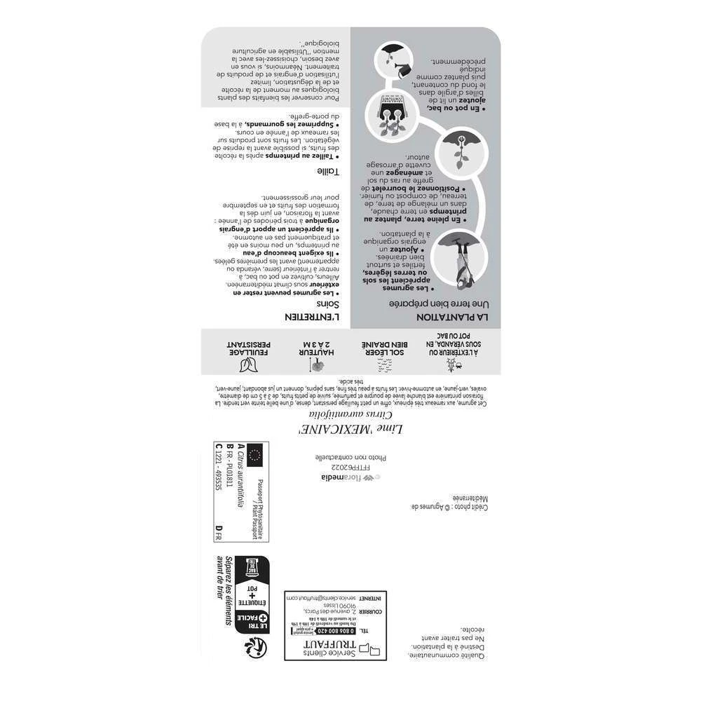 Originaire de l’Asie du Sud-Est, le limettier (Citrus aurantifolia) est l’arbre qui produit les limes, les fameux citons verts. ‘ Mexicaine’ est une variĂ©tĂ© horticole.Ce citronnier atteint une hauteur de 3 m pour une largeur de 2,50 m. Rameaux très Ă©pineux. Feuillage persistant, dense, vert tendre. Feuilles petites, ovales. Floraison blanche, avec des tâches pourpres au dĂ©part, parfumĂ©e, au printemps. Fruits petits, de 3 Ă 5 cm de diamètre, ovales, vert-jaune, en automne-hiver. Fruit Ă peau très fine, sans pĂ©pins, donnant un jus abondant, jaune-vert, très acide. Rustique jusqu’Ă -3°C.On les plante sur la CĂ´te d’Azur en pleine terre, dans un sol lĂ©ger, permĂ©able, bien drainĂ© et non calcaire. Exposition au soleil, Ă l’abri des vents. Partout ailleurs, culture en pot en rentrant la plante dans une vĂ©randa tenue hors gel, Ă une tempĂ©rature de 10°C environ. Ne pas sortir la plante directement au soleil au printemps.